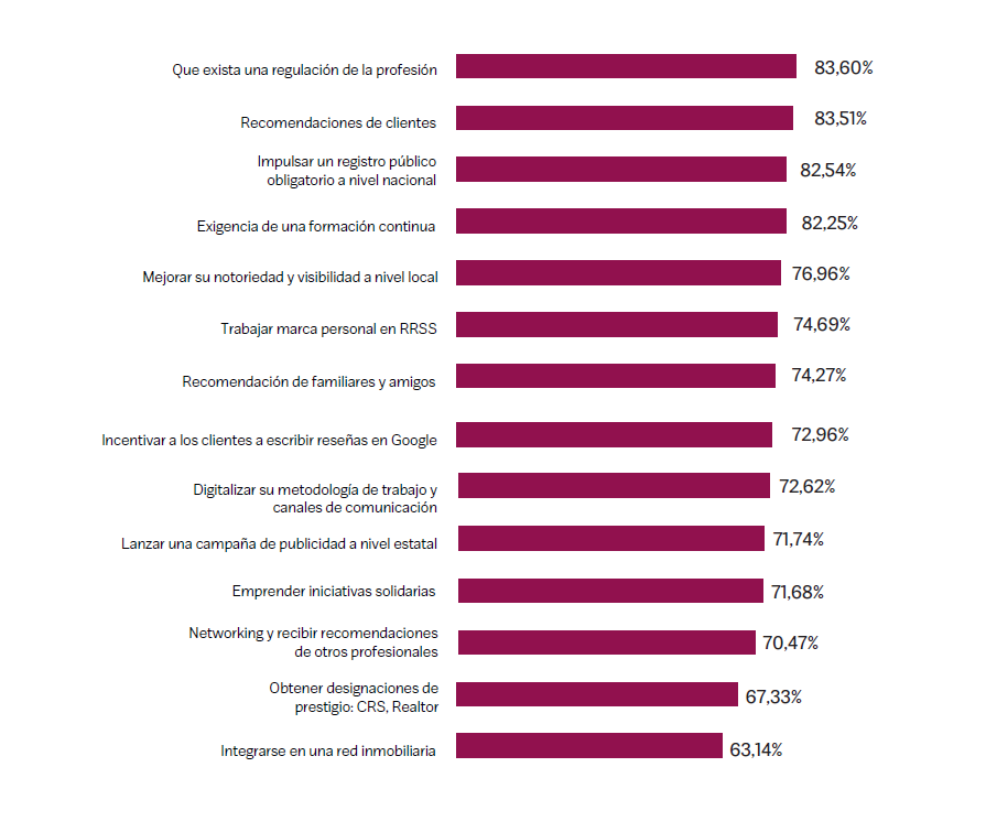 Els immobiliaris consultats també creuen que aconseguir la recomanació de clients és clau per millorar la reputació del sector. També apunten a l'augment de la seva notorietat i visibilitat a nivell local, així com treballar la seva marca personal a canals socials, la realització de campanyes a nivell estatal o realitzar iniciatives solidàries.