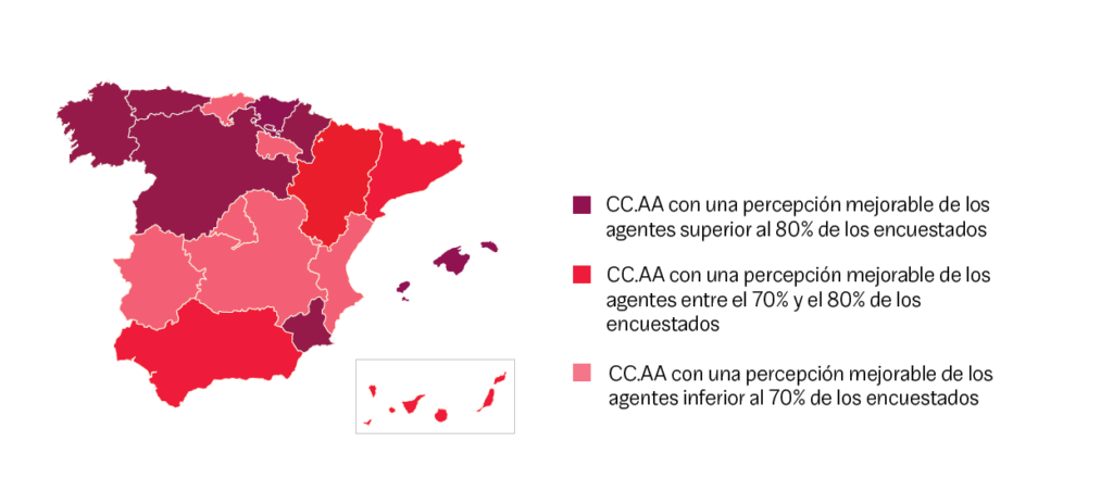 Analizando esta percepción por comunidades autónomas, la mayoría de los profesionales de Baleares, Galicia y País vasco aseguran que su imagen es mejorable, seguidos de los agentes castellanoleoneses (85%), asturianos (83%), murcianos (80%) y navarros (80%).